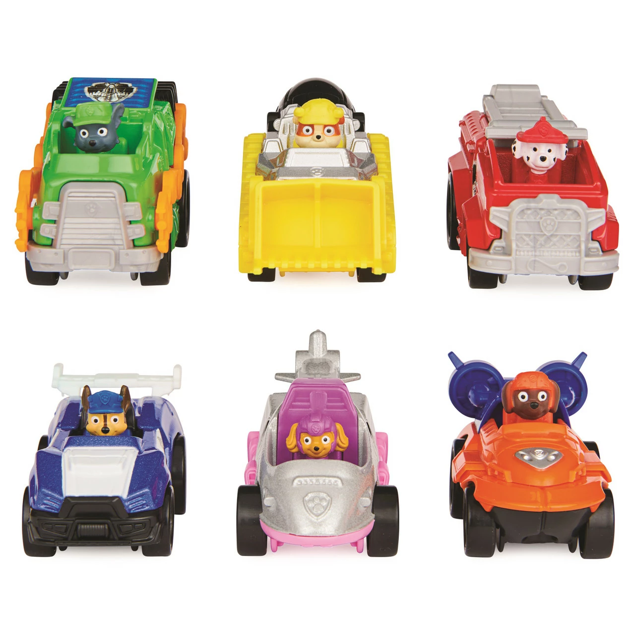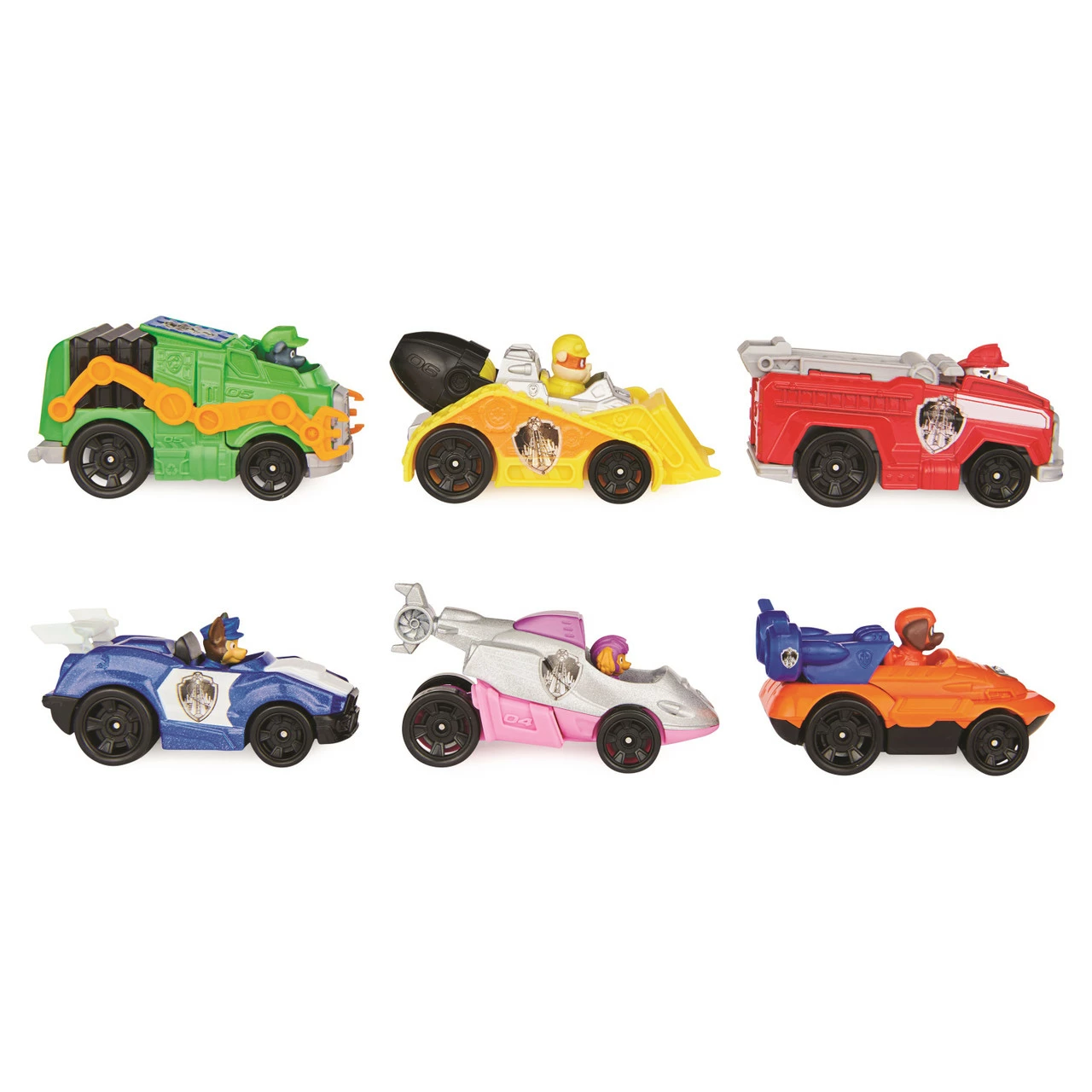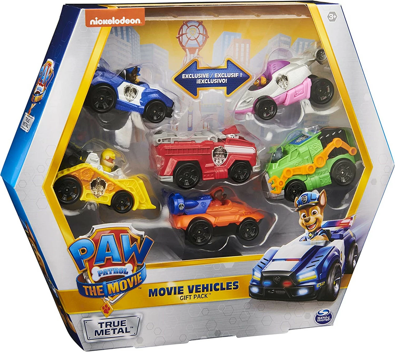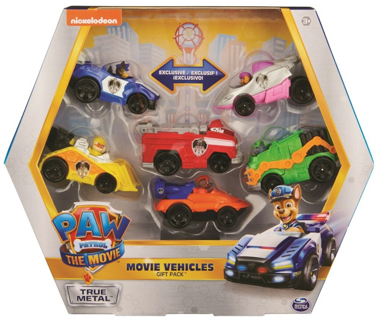 - 6 ORIGINAL PAW PATROL MOVIE TOY CARS:With realistic movie details, graphics, working wheels, and metal material, the 1:55 scale True Metal vehicles look just like PAW Patrol’s sleek city vehicles from the movie!