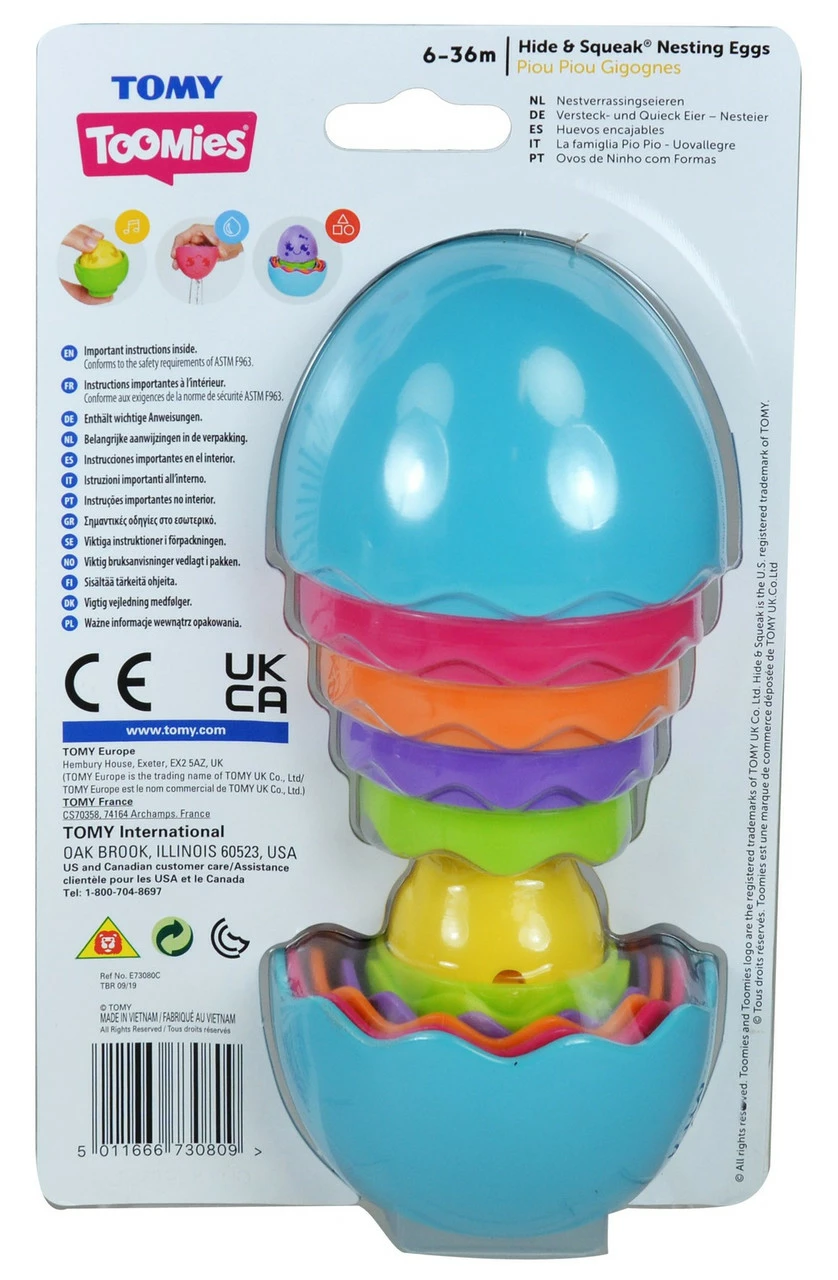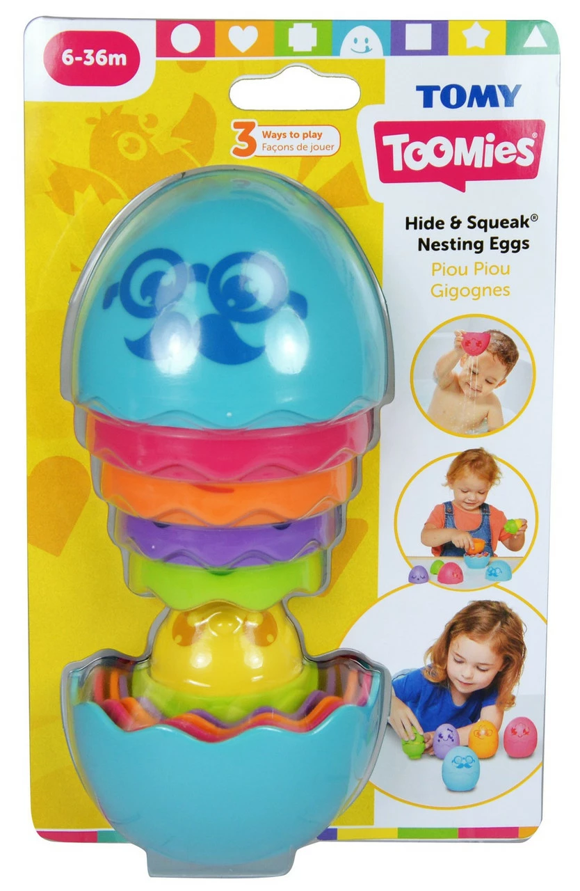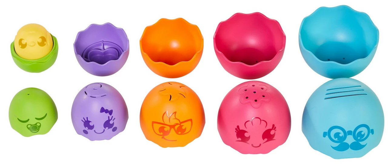 These Hide & Squeak Nesting Eggs love coming out of their shells! That’s because when they get together, they’re a perfect fit. Kids will love the way the eggs’ top and bottom halves nest together. Each egg is a different size and color. Each egg in the family has a distinct happy face that tells its own story. In the middle sits Sora, the yellow baby chick that squeaks when you press down! She fits inside into a shape-sorting heart shape! Nest the bases then match and stack the tops in turn to form one finished egg with all the others hidden inside (perfect for when it’s time to put toys away). Or take them all apart and see if you can match all the pieces to make five eggs, plus the little squeaking Sora, the baby chick in her shell. Plus you have the bonus of a bath time toy: all the pieces have been especially designed so that they love getting wet. There’s lots of fun to be had using the shells as pouring cups: scooping up the water and letting it run through different patterned holes. Designed for little hands, this colorful set stimulates color and shape recognition, sparks the imagination with role play, and fosters motor skills and confidence in water.